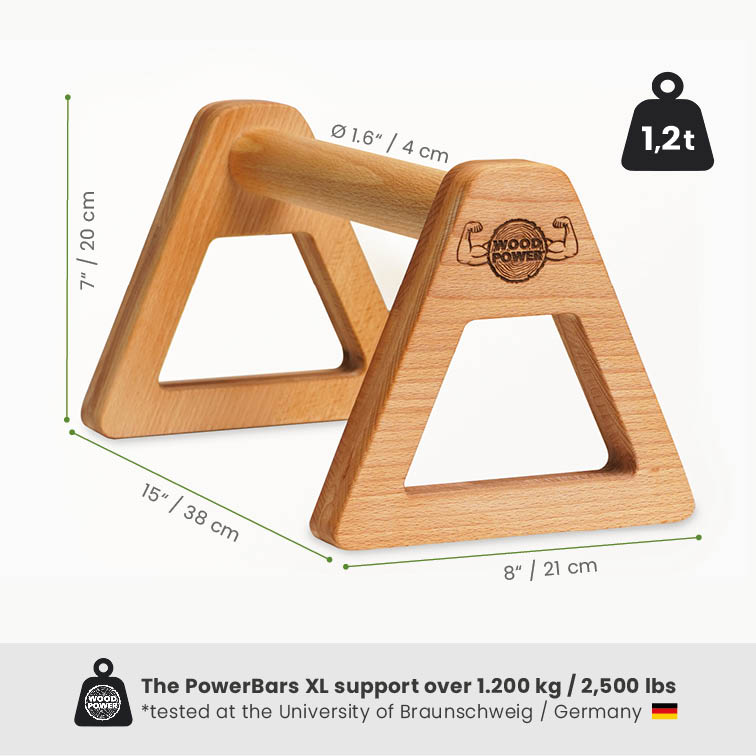 PODER NATURAL. Enriquezca sus entrenamientos de fitness gracias a la fuerza natual de los inmensos bosques de nuestro planeta. ¡Las PowerBars tienen una capacidad de carga de 250 kg (550 lbs) pudiendo soportar con facilidad los entrenamientos más intensos imaginables!